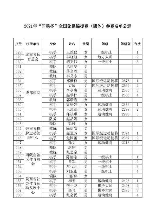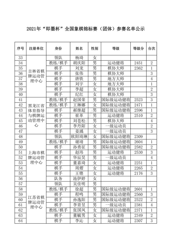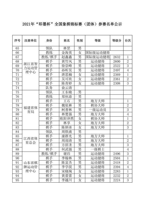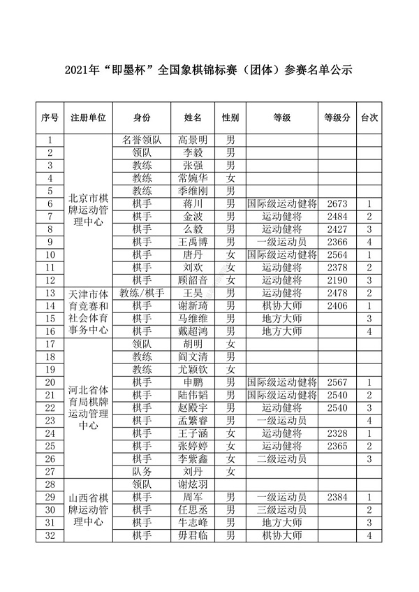 作者:观棋不语 更新时间:2021-06-07 13:07:12 浏览次数:53322021年“即墨杯”全国象棋锦标赛(团体赛)即将于6月8日-13日进行,以下是参赛队伍及棋手名单:
